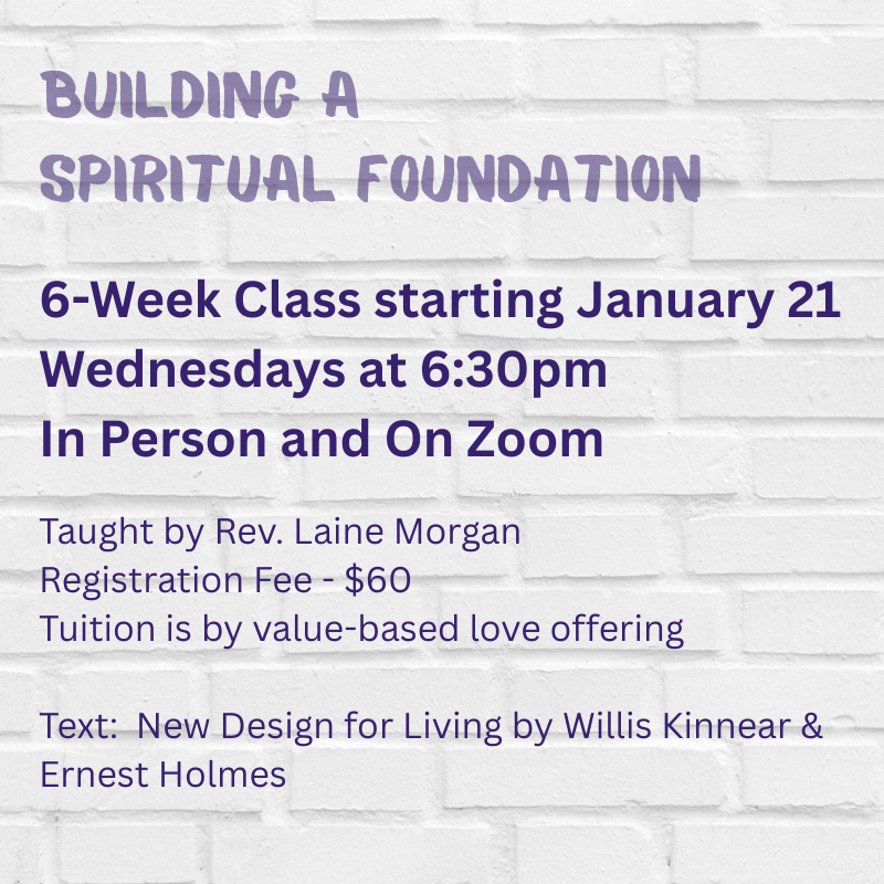 Building a Spiritual Foundation is a 6-week certified course that allows each student to consider the teachings of the Science of Mind and the positive impact it can have on daily living. Together, the class will discuss spiritual principles and laws such as the creative process, oneness, and living in the flow of love.